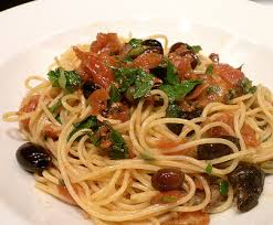 Cocer la pasta en abundante agua hirviendo con sal hasta que esté "al dente". Mientras se cuece la pasta, pelar y picar la cebolla y los ajos. Picar las alcaparras y las aceitunas. Calentar el aceite en una sartén y rehogar la cebolla y los ajos unos 5 minutos. Incorporar el tomate, las alcaparras, las aceitunas y freír durante 10 minutos. Agregar las anchoas picadas, dejando 2 ó 3 para adornar y mezclar. Cuando la pasta esté "al dente", colarla y colocarla en una fuente de servir o cuenco. Añadirle la salsa y la albahaca picada. Mezclar bien y servir con las anchoas reservadas, troceadas por encima.